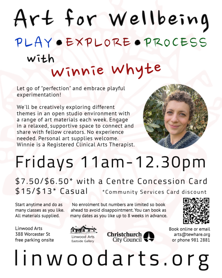 • 22 September – 27 October: PLAY – EXPLORE – PROCESS with Winnie Whyte. Explore a range of therapeutic art modalities and mediums each week and connect with fellow creators in the community. No experience needed. All materials supplied.